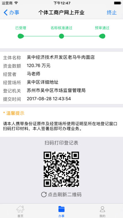 个体工商户所有登记业务都必须本人办理,不可指定委托代理人。申请人通过APP在线提交申请后,直接到所在地登记部门,通过扫描二维码,将申请表格打印出来,交窗口办理相应业务。"苏州个体登记手机通APP"只适用于不需要办理前置许可的个体工商户,需要办理前置许可的个体工商户、港澳台居民办理个体工商户、以及苏州工业园区、张家港保税区范围内的个体工商户登记仍按原有方式去所在地登记窗口进行现场办理。系统采用多重身份验证机制,通过人脸识别、实名认证等技术确保业务办理安全可靠。