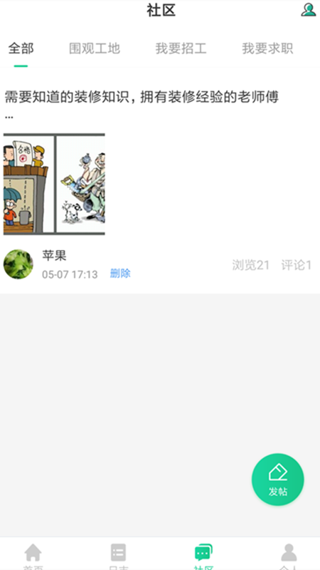 社区:专为装修行业打造的交流平台。工长可以发布招工信息,工人可以寻找合适的工作机会。支持发帖、评论、收藏等互动功能。