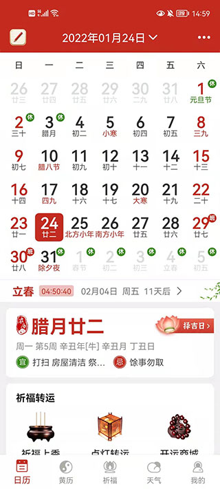 日历:除了简单的日历表以外,该软件还提供了节日提醒等特色服务,让您不错过任何重要日期。黄历:用户们还可以在万年历app中查询老黄历2022年的黄道吉日,了解每日宜忌,为重要活动选择最佳时机。运势:用户还可以在这里查阅一些关于星座的运势以及背景故事,探索星座与生活的奇妙联系。祈福:用户还可以在这里祈祷一些工作、学业、婚姻、家庭等,寄托美好愿望。天气:该软件还支持查看未来的15-40日之内的天气,让出行更加方便,提前做好规划。我的:除此之外,软件中还有星座占卜、三生石、奇门遁甲等特色的生活服务,满足您的多样化需求。