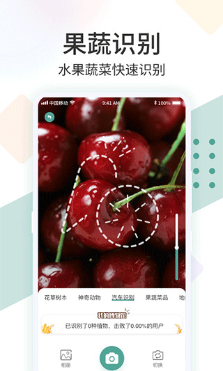 拍照识花:1秒就能知道植物的名字和故事,准确率高达95%以上,让您快速成为植物达人。系统采用先进的AI图像识别技术,可识别超过10万种常见植物。
