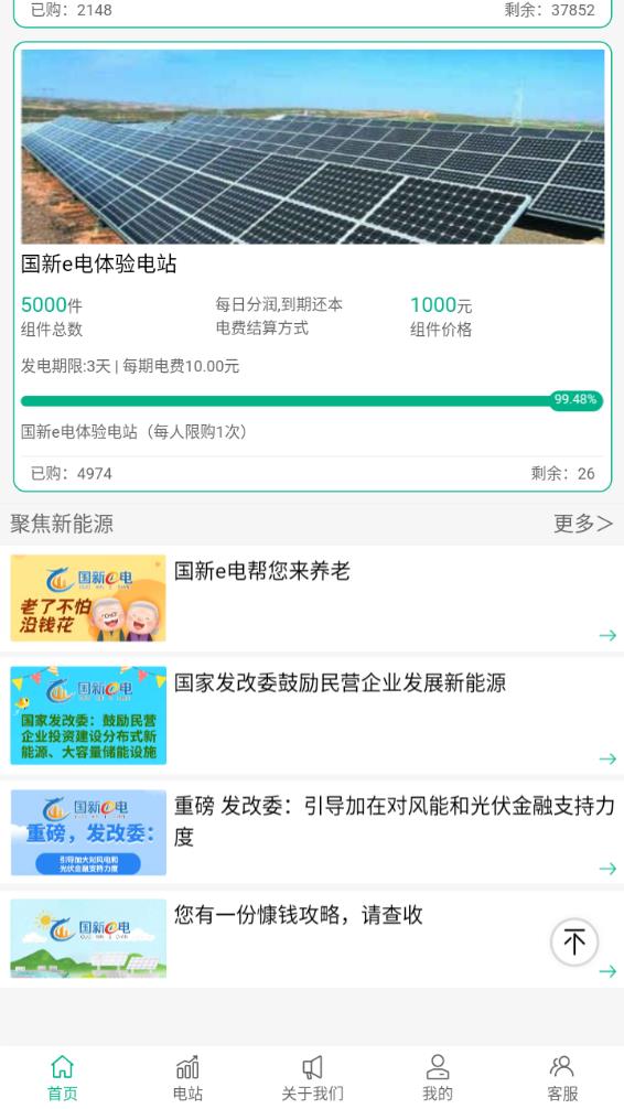国新e电app是一款专注于新能源电站管理的智能平台,为用户提供便捷的在线认购、高效管理和稳定收益的一站式服务。通过创新的技术手段,平台让新能源投资变得简单透明,用户无需专业知识即可轻松参与。除了电站管理功能,平台还设有丰富的积分商城,用户可通过积累的积分兑换各类优质商品,实现投资与消费的双重价值。无论是个人投资者还是企业用户,都能在这里找到适合自己的新能源解决方案。
