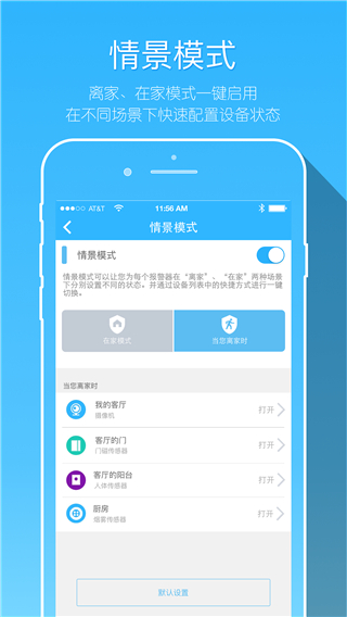 情景模式:离家、在家模式一键启用,在不同场景下快速配置设备状态