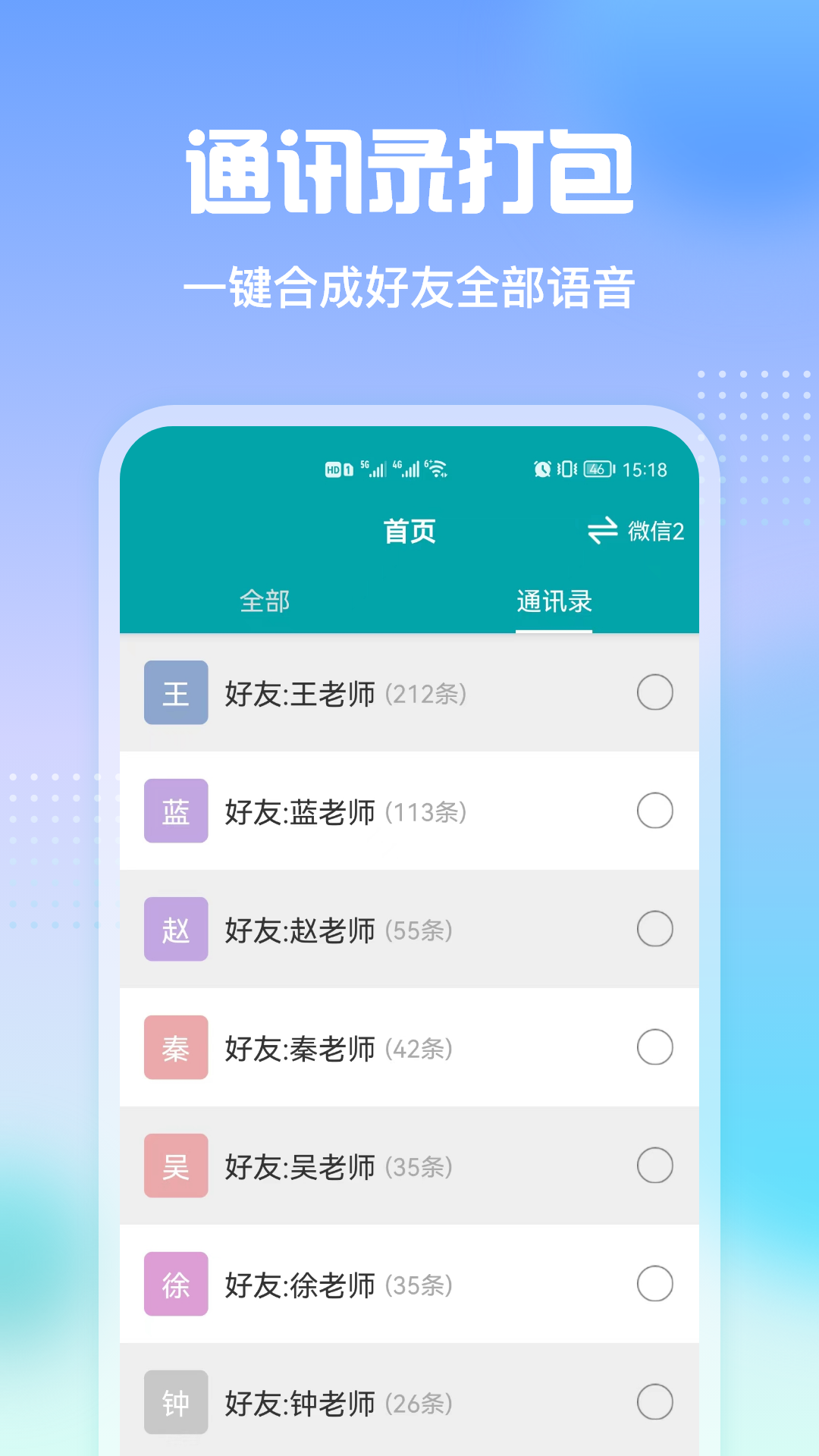 通过语音的时间或者查找好友进行筛选,找到用户想要的语音更加方便,快捷。软件支持多条件组合筛选,可以按时间段、联系人、语音时长等多个维度快速定位目标语音。搜索结果支持预览播放,让用户无需逐个点开就能确认内容。
