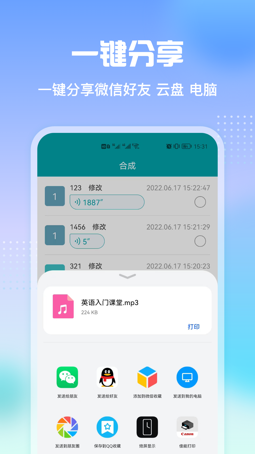 用户可以在导出语音之后一键进行分享,支持分享到微信、QQ、云盘、电脑等多种方式。软件采用智能压缩技术,在保证音质的前提下优化文件大小,让大容量语音也能快速传输。分享时还可以添加备注说明,方便接收方理解内容。
