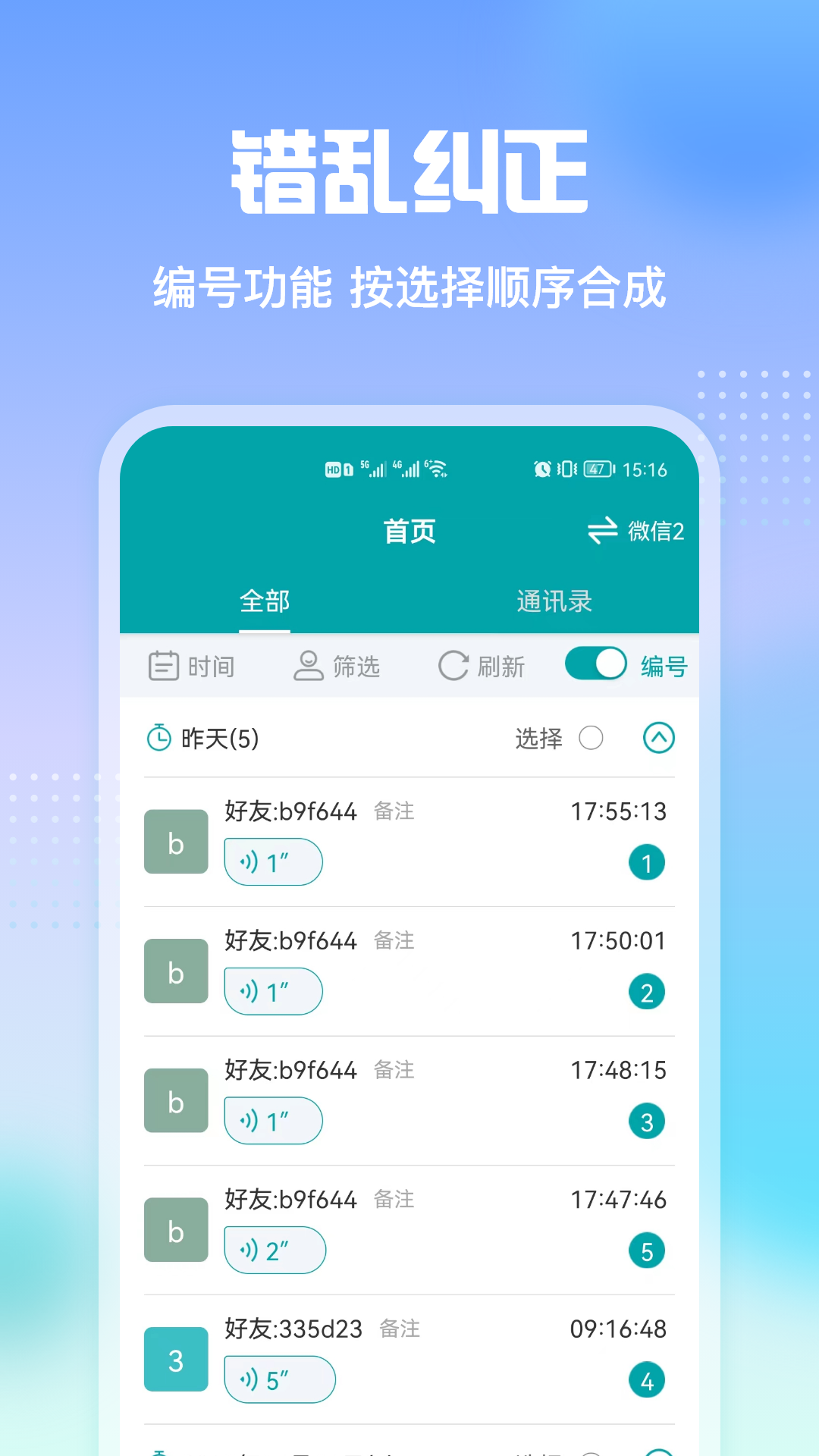 调整用户时间错乱语音,使用编号功能,按选择顺序合成快速纠错!这项功能特别适合整理时间顺序混乱的语音消息,比如跨时区的会议记录或多人轮流发言的场景。用户只需简单拖拽编号,就能重新排列语音顺序,操作直观便捷。