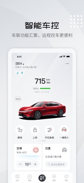 远程控制功能让车主可以随时随地操控车辆,打破空间限制。车况监测功能可以实时显示燃油、电量、车门状态、胎压等关键信息,让车主对车辆状况了如指掌。精准的定位服务不仅能帮助车主快速找到车辆位置,还能在电量不足时智能推荐附近的充电桩。此外,APP还提供了丰富的汽车生活内容,让车主发现更多有趣的用车体验。