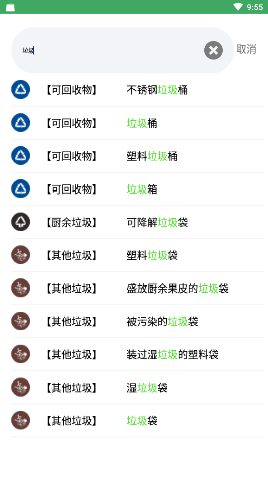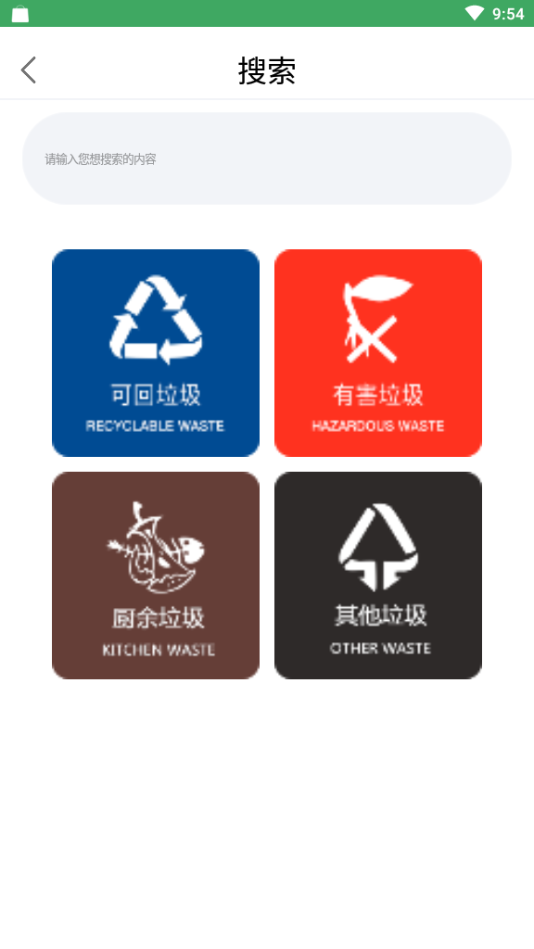 【搜索查询】搜索框输入垃圾名称,快速指导垃圾分类。支持模糊搜索和联想功能,即使输入不完整也能智能匹配相关结果。搜索结果不仅显示分类归属,还会提供同类垃圾的处理建议。