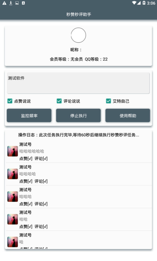 在登录界面输入账号密码或扫码完成授权,开启秒赞秒评功能后,软件会智能识别新发布的说说内容。系统采用先进的动态监测算法,确保不会错过任何一条好友动态。用户可以在设置中调整监测频率,选择仅在特定时间段运行,或者设置关键词过滤不需要互动的动态内容。