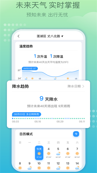 天气趋势预测:软件提供未来15天的天气预报服务,包括逐日温度范围、天气现象、风力风向等关键信息。特别设计了趋势变化图表,直观展示气温、降水等要素的变化规律,帮助用户更好地规划中长期活动安排。