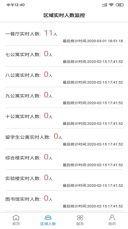 实时区域人数:通过智能定位技术,实时显示各教学楼、食堂、宿舍等场所的人员密度,帮助师生合理规划活动路线。