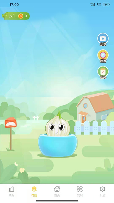 进入花园页面,查看展示的花朵和花盆,并点击任务、装扮等功能,每日任务会指引孩子完成基础饮水量;