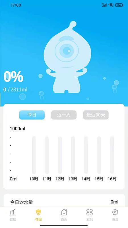 提供了喝水数据统计,选择周期查看展示的数据统计图表,支持按日/周/月多维度分析饮水习惯;