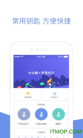 APP开门:打开小智社区APP,在首页点击"钥匙"图标即可快速开门。如需管理多个门禁权限,可点击"全部钥匙"查看详细列表。