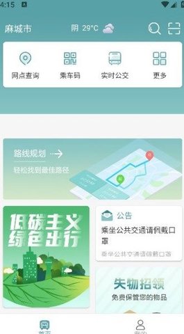 鼓励乘坐公交出行,减少碳排放,为环保做贡献。麻城公交与环保部门合作开展绿色出行宣传活动。提供公交出行的便利,让更愿意选择绿色出行方式。每月会评选环保出行达人并给予奖励。推动城市的可持续发展,让麻城的空气更清新。应用内设有环保知识专栏。一起为保护环境出一份力,从公交出行开始,每季度会公布市民的环保出行数据报告。