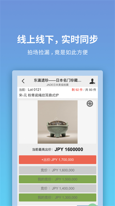 实时参与竞拍:无论您身在何处,都能通过手机实时参与竞拍。再也不用担心错过重要拍卖会,随时随地,想拍就拍。