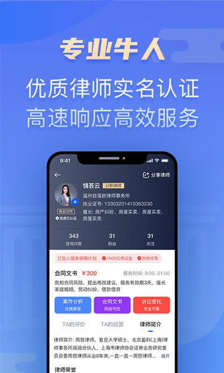 为你展示了详细的介绍信息,包括律师服务、律师档案、综合评分、平均相应时长等。平台采用大数据分析技术,实时更新律师服务数据,确保信息准确可靠。用户评价系统透明公开,每项评分都有具体评价内容作为参考。