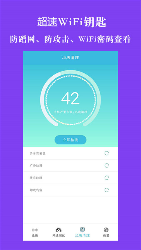 超速WiFi钥匙作为一款智能上网工具,具备自动获取WiFi热点的强大功能,能够帮助用户快速发现并连接周围可用的开放WiFi网络,尤其适合在外出或旅行时使用。此外,软件还提供专业的网络测速服务,可以实时检测网络延迟、上传速度和下载速度,让您对当前网络状态了如指掌。如果您的手机运行缓慢,超速WiFi钥匙还内置了垃圾清理功能,能够一键清除无用安装包、系统缓存、残留文件等垃圾数据,有效释放存储空间,提升手机运行速度。