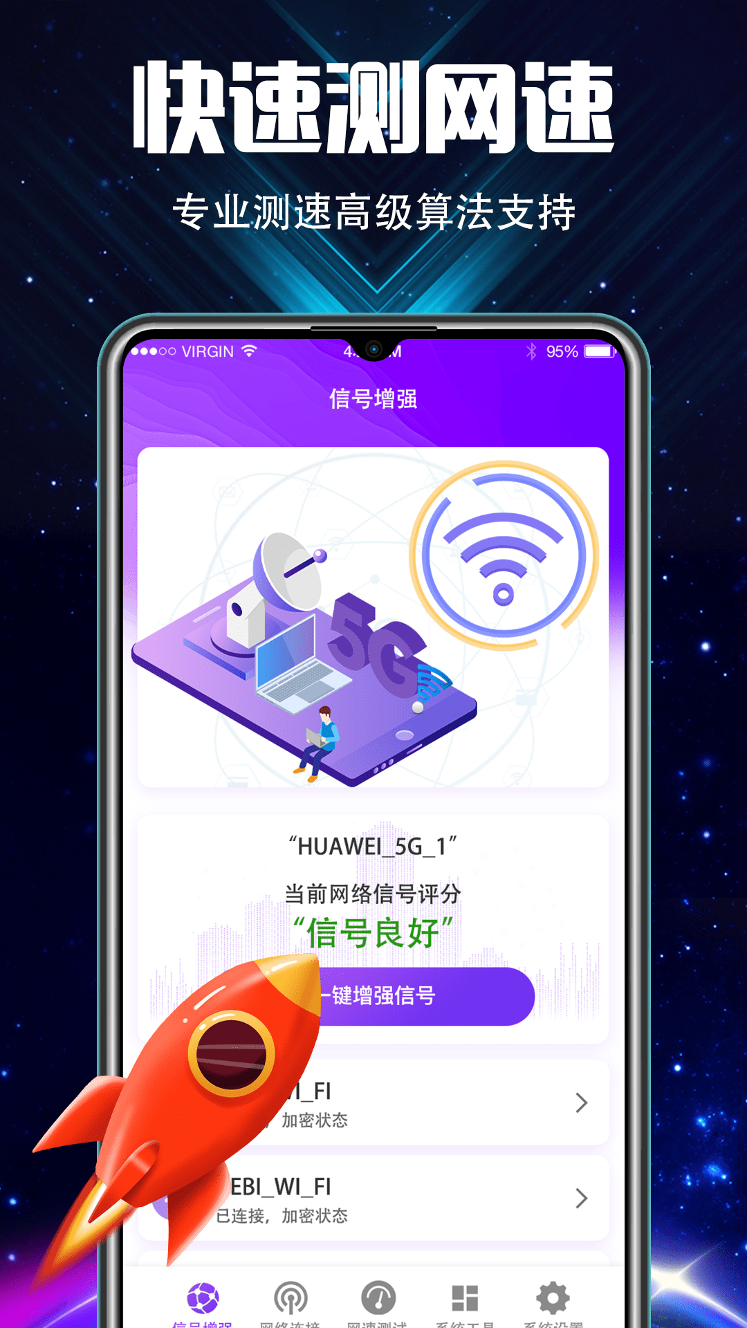 一键测速:采用专利测速技术,支持2G、3G、4G、5G及Wi-Fi网络的速度测试,结果精准可靠;