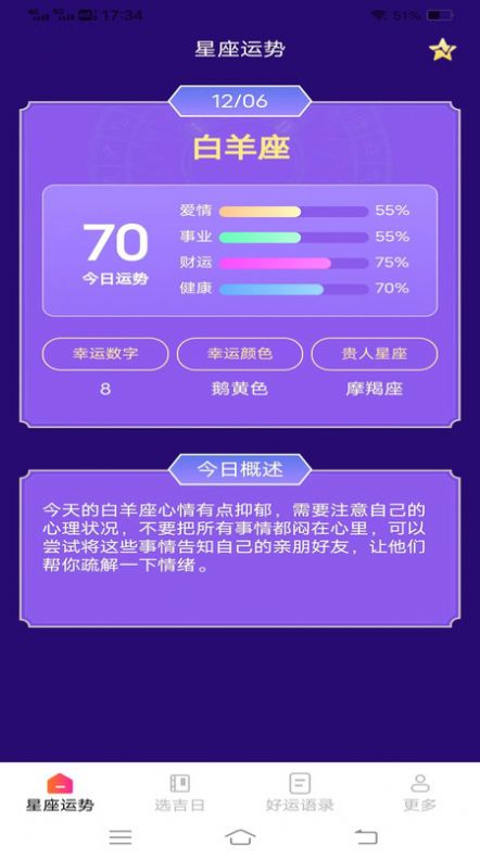 乐乐好运来最突出的特点是其高度的用户友好性。用户可以根据自身情况选择对应的星座进行运势查询,操作简单直观。软件提供的人物性格分析功能,帮助用户深入了解自己和他人的特点、优势与不足,促进人际关系的和谐发展。