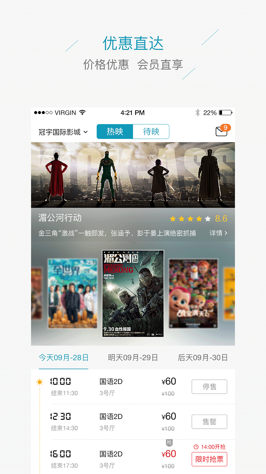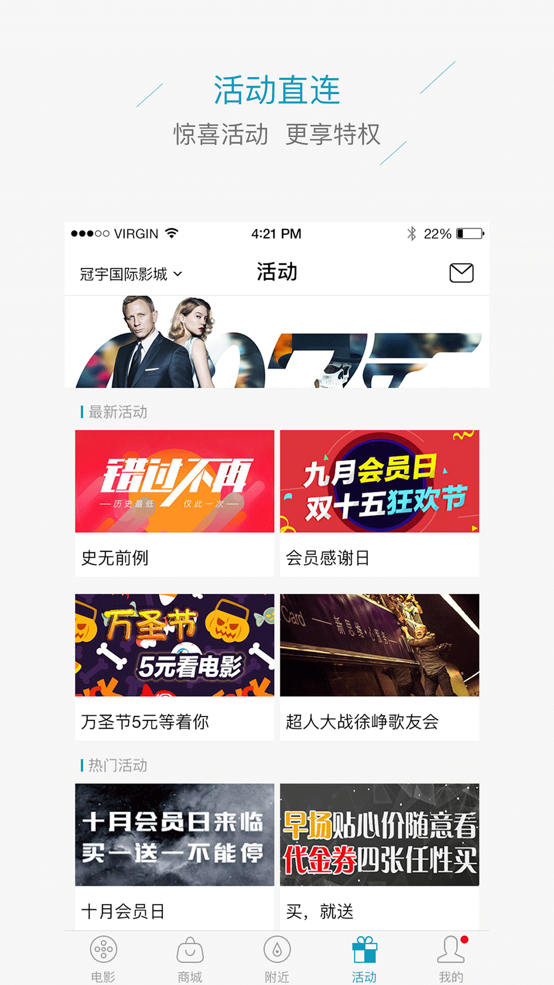 亲,影院自营APP来袭啦,各位电影迷们的福利来咯,app拥有独立的会员体系,影院不定期举办限时购票等优惠活动,会员可以在app内查看近期内举办的活动,还可以在商城选择影院卖品及会员卡,注册app会员还送优惠券,会员等级享受荣耀待遇哦。每月8号会员日全场5折起,生日当月更可领取免费观影券,银卡以上会员还能参与明星见面会抽奖。