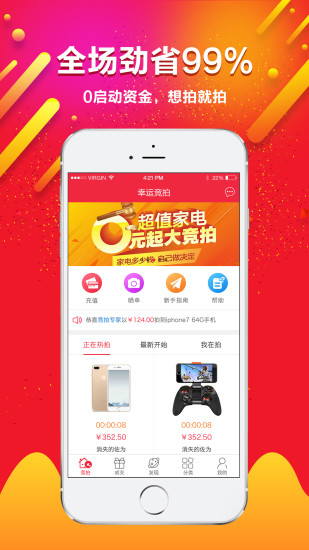 全场商品初始价为0,每拍一次价格只上涨0.1元,10秒内无人竞争,您即可以前所未有的低价带走心仪商品