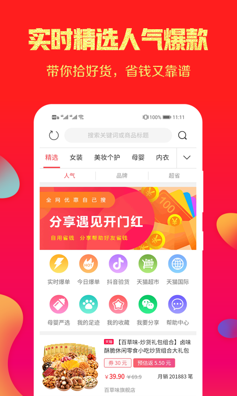 全网搜索功能让您轻松找到心仪商品,每日更新的大额优惠券让购物更省钱。一键免费领取优惠券,操作简单便捷,省下的钱还能直接提现到账。平台商品品类丰富,编辑团队手工精选数百万优质商品,确保分类准确、商品齐全。各类明星同款、网红爆款的服装、包包、化妆品应有尽有,热门单品实时更新,让您紧跟时尚潮流。独特的优惠券搜索功能让您在购物前就能找到最划算的优惠,千万商品任您挑选。精彩预览板块每日推送超值特价商品,让您不错过任何优惠机会。