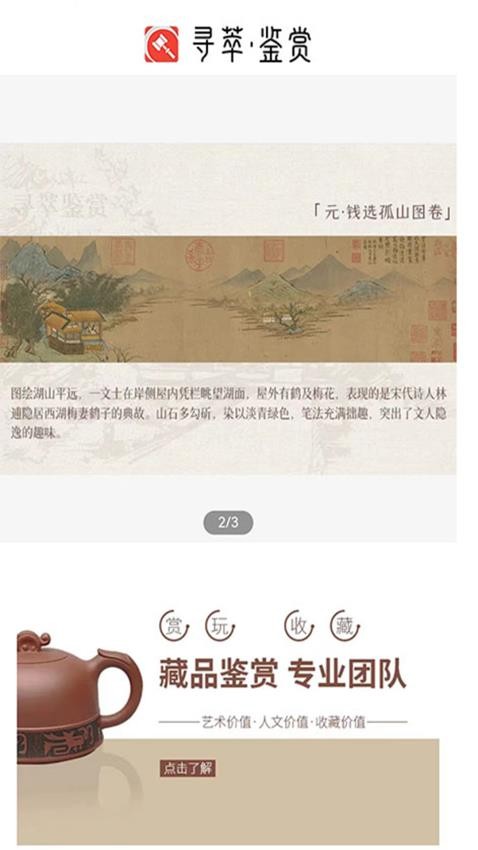 寻萃是一款专业的艺术品在线查询与交易平台,致力于为用户提供便捷、安全的拍卖体验。通过智能化的推荐系统和丰富的藏品资源,用户可以轻松浏览各类艺术品、古董及收藏品,并享受个性化的竞价服务。平台不仅提供多样化的交易方式,还配备了专业的鉴定估价团队,确保每笔交易的真实性与可靠性。无论是资深收藏家还是艺术爱好者,都能在这里找到心仪的藏品,体验高效透明的拍卖流程。