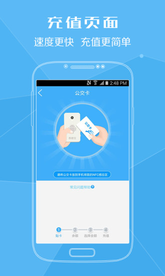 充值不排队:采用先进的NFC技术,手机贴卡即可为普通公交卡充值,3秒完成操作。
