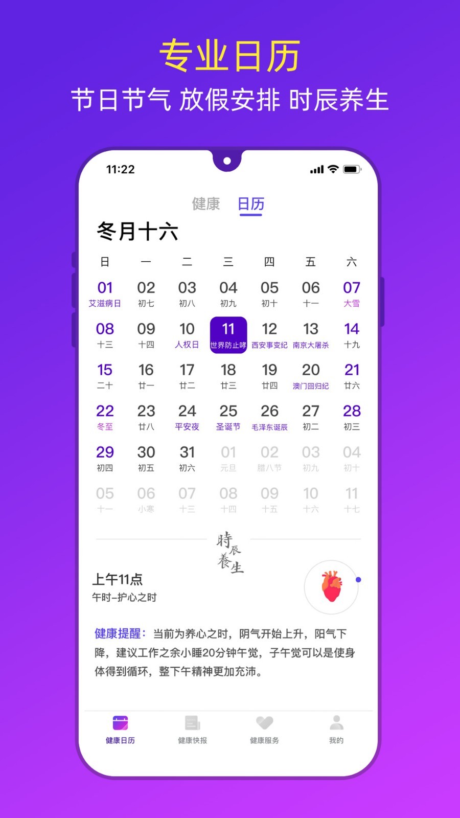 应用保留了传统日历的核心功能,清晰展示公历、农历日期、星期信息,并标注国内外重要节日和二十四节气。界面设计简洁美观,支持添加个人日程和健康计划。用户可以记录每日的健康状况和生活习惯,形成可视化的健康日志,方便追踪健康改善进度。