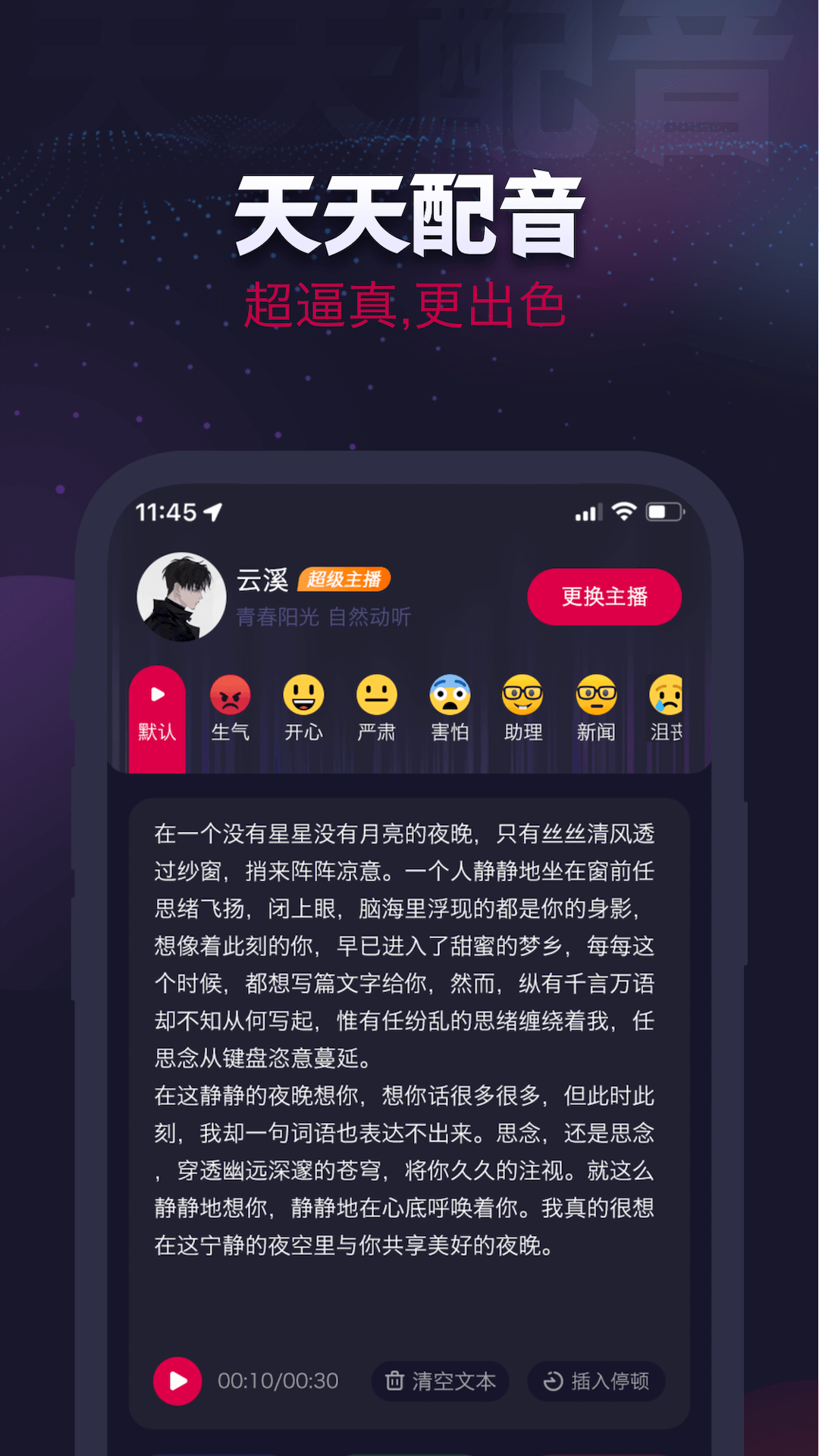 天天配音是一款专注于文字转语音的智能工具,采用行业领先的语音合成技术,为用户打造高效便捷的配音服务平台。平台汇聚了上百位风格各异的主播,支持普通话、英语、粤语、四川话等多种方言及语言音色。此外,还提供大量真人录制的广告促销成品音频,用户可直接下载使用。无论是个人创作还是商业需求,天天配音都能提供专业级的语音解决方案。