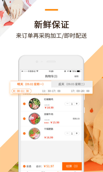 来订单再加工,即时送达,确保新鲜。采用智能调度系统,保证食材从仓库到用户手中的时效性。