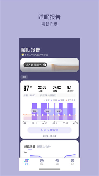 C-Life睡眠App是一款集成了实时监控、睡眠报告、改善日记、家居助眠等多项功能的综合性睡眠管理平台。它采用先进的算法技术,能够对用户的睡眠数据进行深度分析和挖掘,自动生成详细的睡眠质量报告,并根据长期监测结果提供针对性的改善建议。