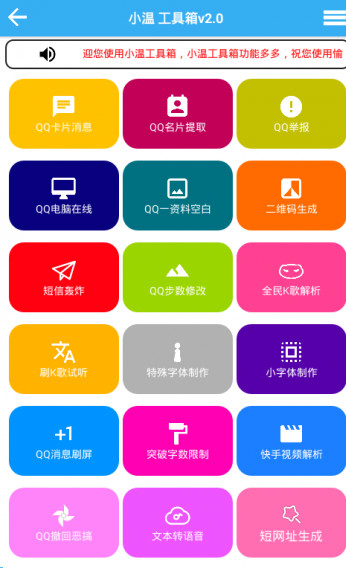 小温工具箱app是一款功能强大且实用的全能型应用软件,为用户提供了丰富多样的实用工具和便捷功能。无论是日常生活中的小需求,还是社交娱乐中的特殊操作,这款软件都能轻松满足。它集成了海量QQ相关功能、K歌解析、字体生成等特色工具,操作简单直观,体验流畅舒适,绝对是您手机中不可或缺的利器,赶快下载体验吧!