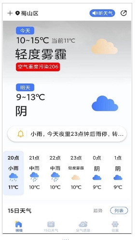 《天气预报灵v1.0最新安卓版》是一款功能强大且实用的天气查询工具软件,专为安卓用户设计。它以简洁大方的界面设计和清晰明了的功能布局,为用户带来极佳的使用体验。软件体积小巧,占用内存极少,完全不会影响手机运行速度,让用户几乎感受不到它的存在。通过这款软件,用户可以直观地查看所在城市的实时天气情况,包括温度、湿度、风力等详细信息。更贴心的是,它还支持真人语音播报功能,让用户无需盯着屏幕就能获取天气信息,特别适合开车或忙碌时使用。