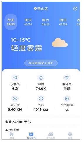 软件采用权威气象数据源,确保天气信息的精准度,用户可以根据播报数据合理安排出行计划。它支持全国范围内所有城市的天气查询,只需简单点击切换地区,就能立即获取目标城市的天气状况。当遇到恶劣天气时,如沙尘暴、暴雨、台风等,系统会自动弹出醒目的预警页面,第一时间提醒用户注意防范。此外,软件还提供详细的空气质量监测功能,用户可以随时查看各时间段的空气污染指数,在污染严重时提前做好防护措施,保护自身健康。