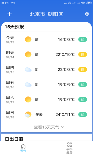 日出日落:动态呈现每日日出日落时间,并附带空气质量、风力风向等实用信息,为户外活动提供参考;
