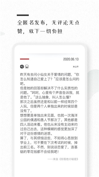 在密言本记中,用户可以完全放下社交压力,以匿名身份畅所欲言。平台提供了丰富的记录功能,包括日记撰写、心情记录、生活感悟等,所有内容都可以自由设置个性化封面和排版样式。更特别的是,用户可以将自己的记录分享到互动圈,与来自全国各地的匿名用户进行心灵交流,这种独特的分享机制让许多内向的用户也能找到倾诉的出口。