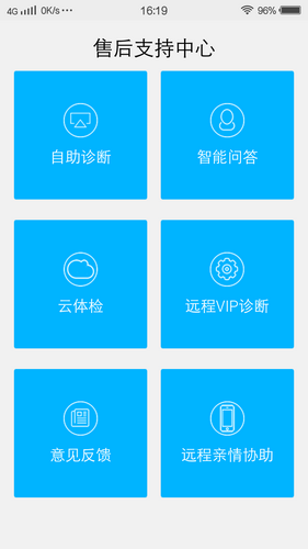 vivo售后支持中心app由六大核心模块组成:自助诊断、智能问答、云体检、远程VIP诊断、意见反馈和远程亲情协助。每个模块都针对不同的用户需求设计,共同构成了完整的售后服务体系。