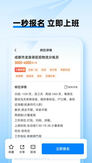 【招工快,当天到岗】企业招聘不再困难,一键发布职位信息,最快8分钟完成面试,当天即可到岗工作。平台特别适合急需用工的工厂、门店等企业,让招聘变得轻松高效。