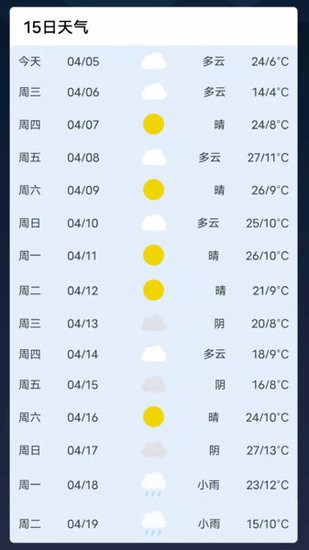【15日天气】未来15天的天气预报情况,包含温度趋势图、降水概率、风力风向等详细数据,帮助用户提前规划出行。