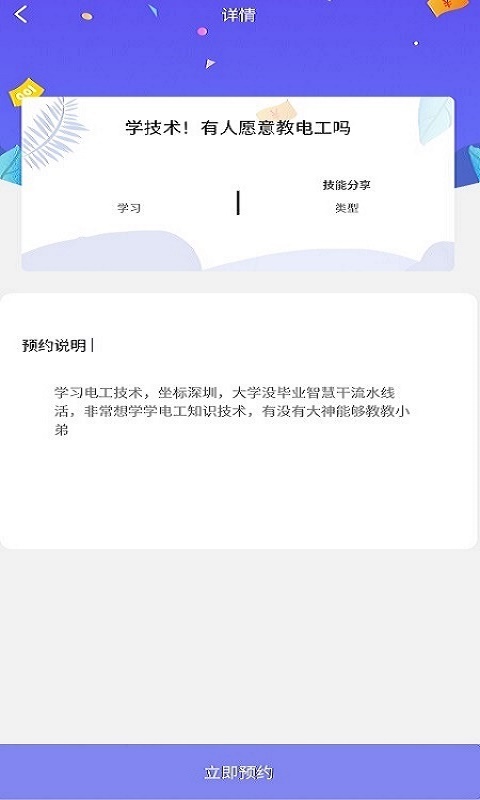 发布需求功能支持用户详细描述自己的具体需求,包括学习互助、语言交流、考试辅导等多种类型。平台会智能匹配最适合的技能提供者,确保需求得到高效解决。每个需求都会获得专业的分类和标签,提高匹配的精准度。
