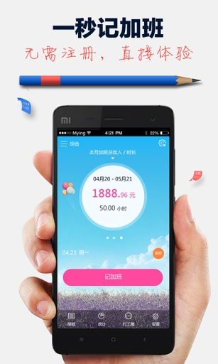 记加班是专为蓝领群体设计的加班、记账、社交一体化应用。通过简单的设置即可进行笔记、日历、计算、计时、工资、考勤等相关重要信息的记录。软件特别设计了智能提醒功能,确保不会错过任何重要的工作安排。同时,记加班为工友提供一个交友、聊天的专属社交平台——打工圈,用户只需绑定工厂,可以自由分享自己的八卦、糗事、秘密,让快乐讯速传递;轻松勾搭厂里的美女帅哥,让艳遇不再百思不得姐;在这里,我们为您提供史上最温情的贴吧,让美甲、节操、吐槽充满乐趣。平台还定期组织线上活动,增进工友间的互动交流。