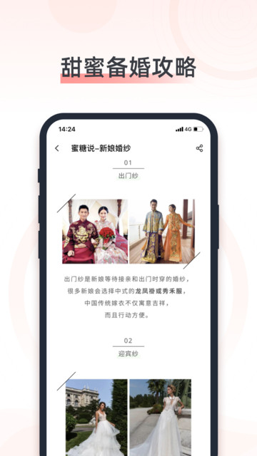 【婚嫁服务】婚奢汇APP提供全方位的婚嫁服务,包括:专业婚纱摄影团队推荐、全球知名品牌婚纱礼服试穿预约、个性化婚礼策划方案定制、星级婚宴酒店比价预订、豪华婚车租赁服务、蜜月旅行线路规划等。每个服务环节都有专人对接,确保您的婚礼筹备过程顺畅无忧。