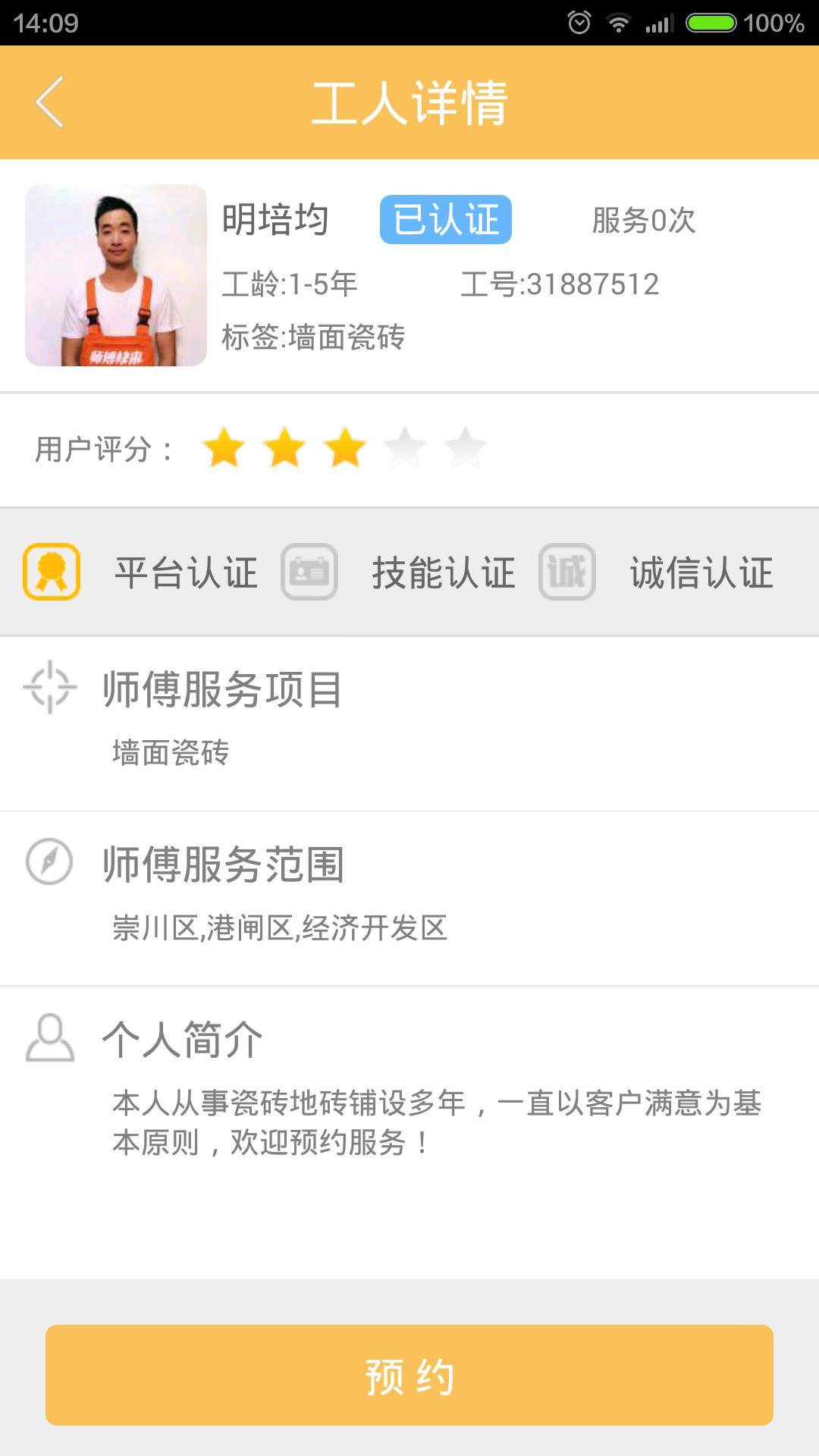 每位师傅都拥有详细的个人资料展示,包括服务年限、专业技能、用户评价等信息,让用户在下单前就能全面了解师傅资质。