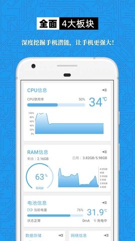 手机设备信息大全这是一款功能强大的手机设备信息查询工具,通过四大核心板块为用户提供全方位的设备管理服务。软件能够快速检测并展示手机的各项硬件参数和系统信息,包括CPU、GPU、传感器、电池等关键部件的详细数据。同时还能实时监控网络状态、流量使用情况以及存储空间占用,让用户对自己的设备了如指掌。无论是日常维护还是性能优化,这款软件都能提供专业的数据支持,帮助用户更好地管理和使用手机设备。