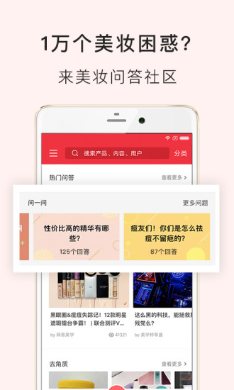 【变美问答组团变美】设有专业的美妆问答板块,解答用户关于美妆护肤的各种疑问。通过互动交流,与更多爱美人士一起抱团成长,实现颜值进阶。