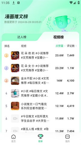 傻瓜推文拥有完善的个人作品管理系统,用户可以方便地对所有创作进行整理、分类和排列展示。软件会实时更新每篇文章的点赞数据,让创作者能够随时掌握作品的热度变化。粉丝增长情况也会以直观的图表形式呈现,帮助用户了解内容传播效果。特别值得一提的是,傻瓜推文内置了专业的漫画推文排行榜,包括达人榜和视频榜,用户可以随时查看当前最受欢迎的内容和创作者,获取创作灵感和行业动态。