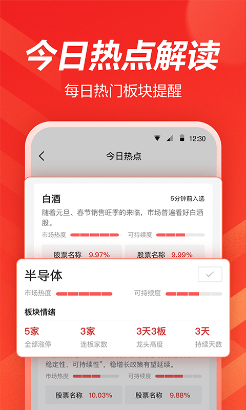 产品突出优势:策略选股,轻松锁定热股:大数据、人工智能、量化策略三大核心力量保驾护航,多维度智能选股策略,自动捕捉关注度飙升热股,深度挖掘财务指标,锁定净利润涨幅超百倍的价值好股。智能选股系统还会根据市场变化自动调整策略参数,确保选股结果始终符合当前市场特征。
