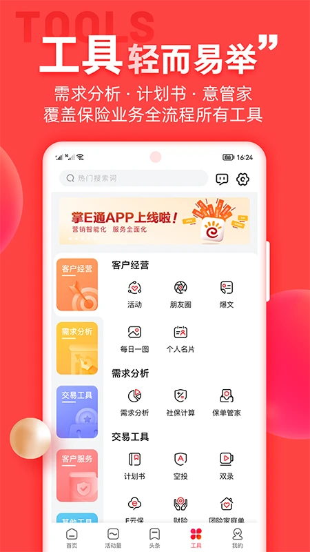 在售前阶段,掌e通APP通过智能获客功能帮助销售人员精准定位潜在客户,内置的活动管理模块支持各类线上线下的获客活动策划与执行。售中环节则提供了强大的业务支持工具,包括产品展示、方案设计、保费试算等实用功能,让销售过程更加专业高效。售后服务体系更是覆盖了保单管理、客户维护、续期提醒等关键环节,确保服务质量持续提升。