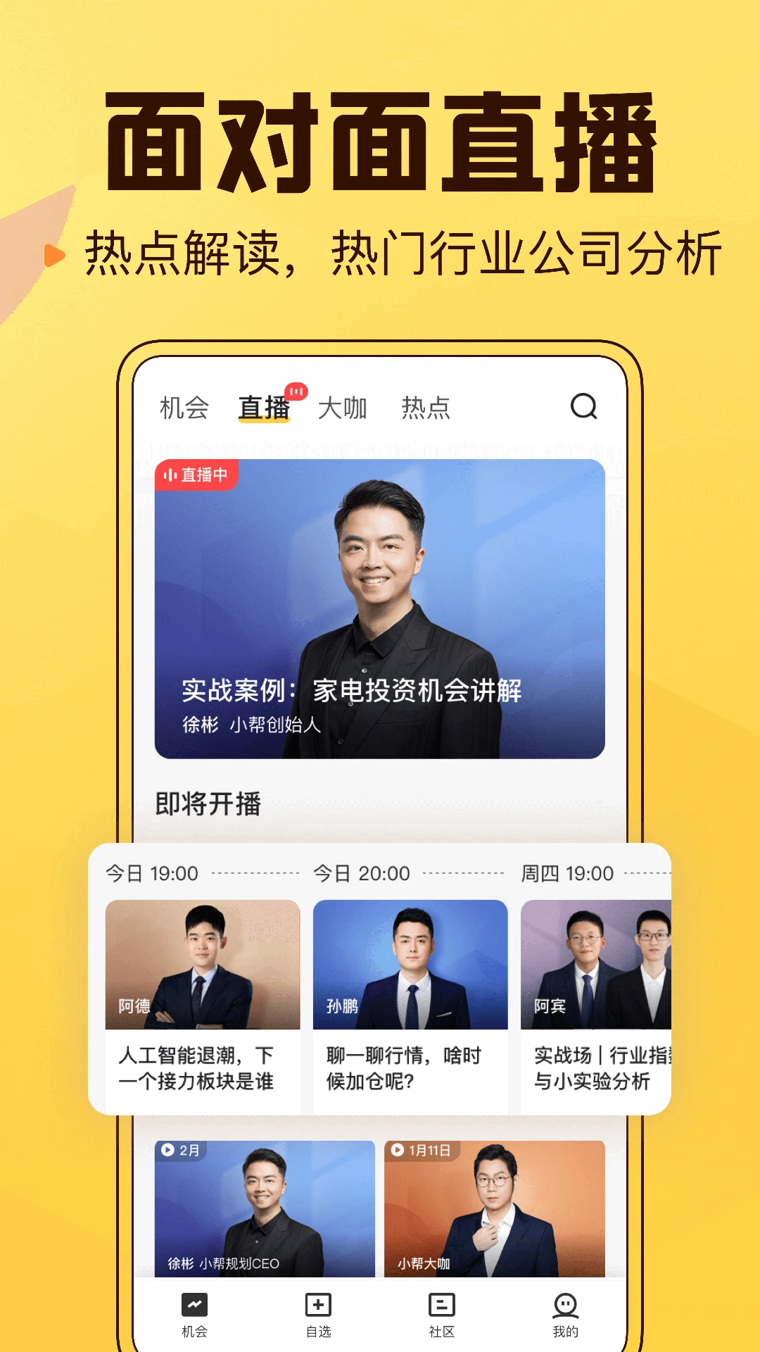 「面对面直播」:定期举办各类专题直播活动,包括市场行情深度解析、热门行业及上市公司研究、基本面与技术面分析等专业内容,帮助投资者提升投资技能。